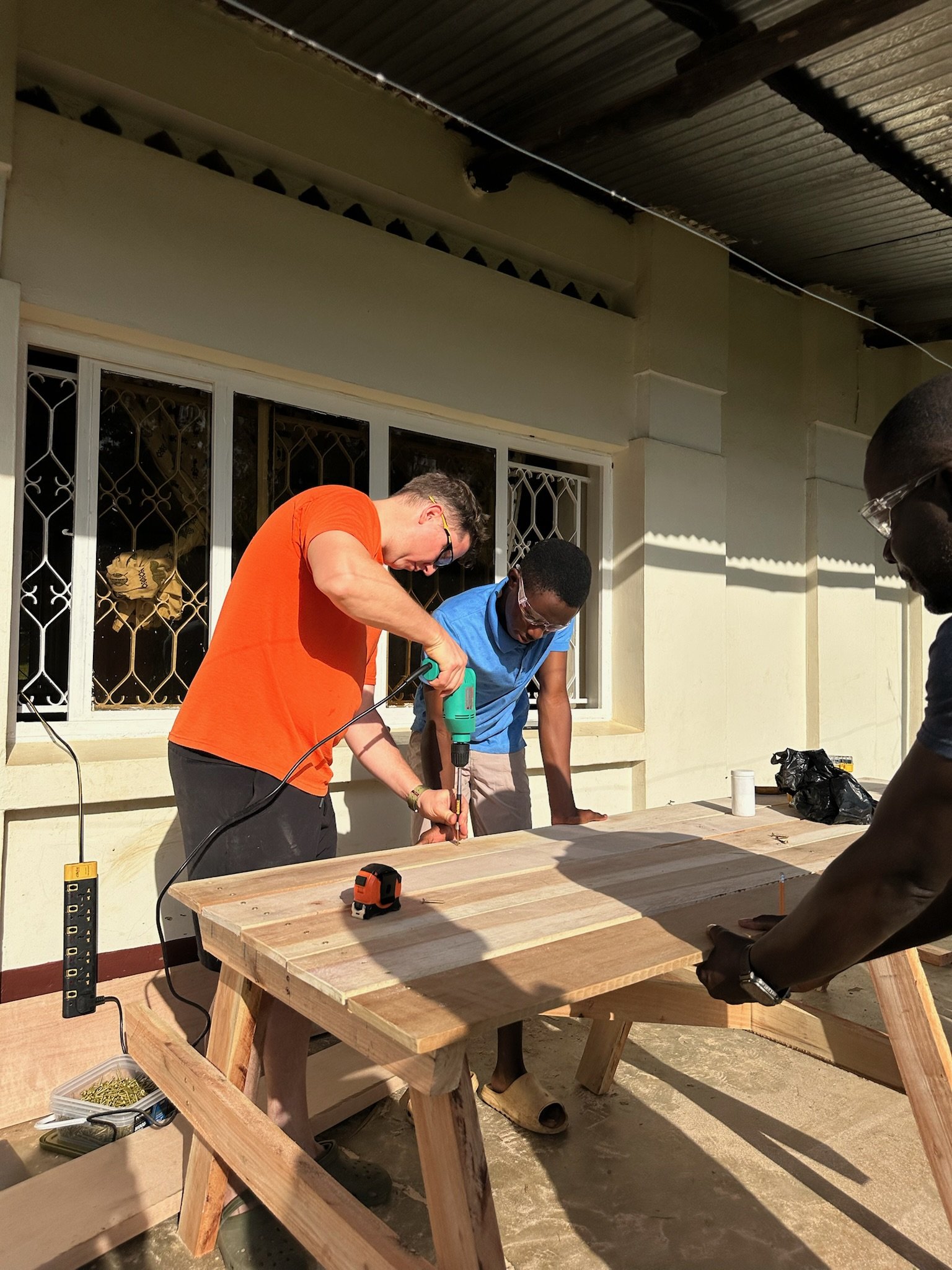 I went on my first trip in January of 2025 to help provide critical infrastructure to the clinic. Working with the Engeye scholars, we built new tables, Adirondack chairs, and repaired benches used by patients waiting for care.